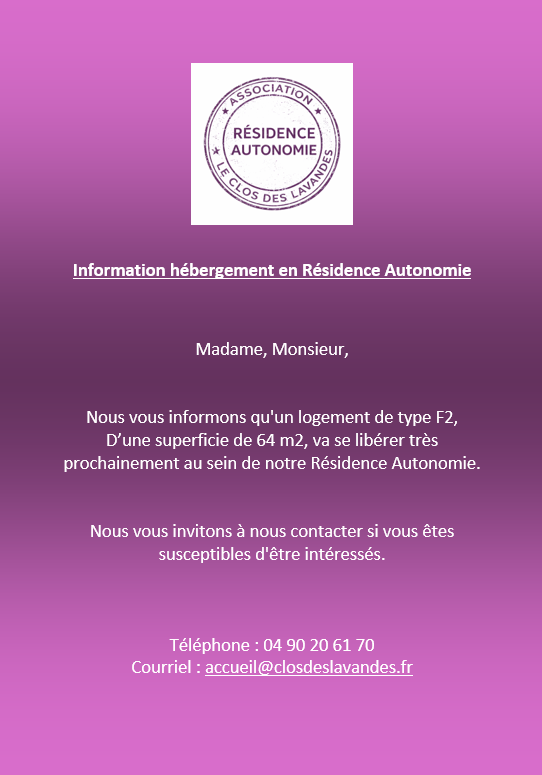 La Résidence "Le Clos des Lavandes" se compose de deux établissements. Une Résidence Autonomie pour Personnes âgées autonomes, géré par une association Loi 1901 créée à l'initiative d'un groupe d'élus de la Commune de l'Isle-sur-la-Sorgue en 1978. La volonté de ces élus étant de pourvoir la commune de logements sociaux adaptés aux personnes âgées.